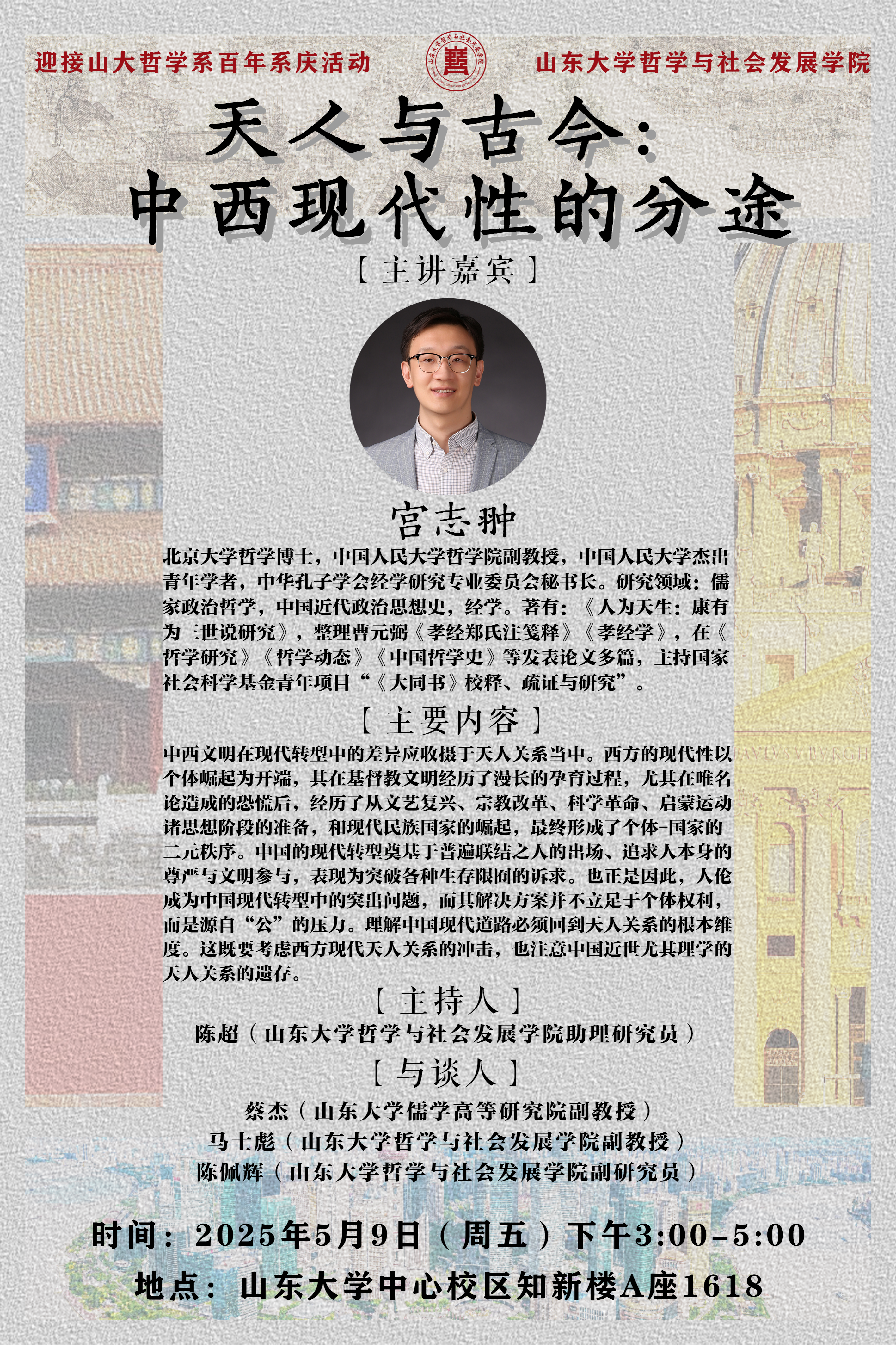宫志翀,北京大学哲学博士,中国人民大学哲学院副教授,中国人民大学杰出青年学者,中华孔子学会经学研究专业委员会秘书长。研究领域:儒家政治哲学,中国近代政治思想史,经学。著有:《人为天生:康有为三世说研究》,整理曹元弼《孝经郑氏注笺释》《孝经学》,在《哲学研究》《哲学动态》《中国哲学史》等发表论文多篇,主持国家社会科学基金青年项目“《大同书》校释、疏证与研究”。