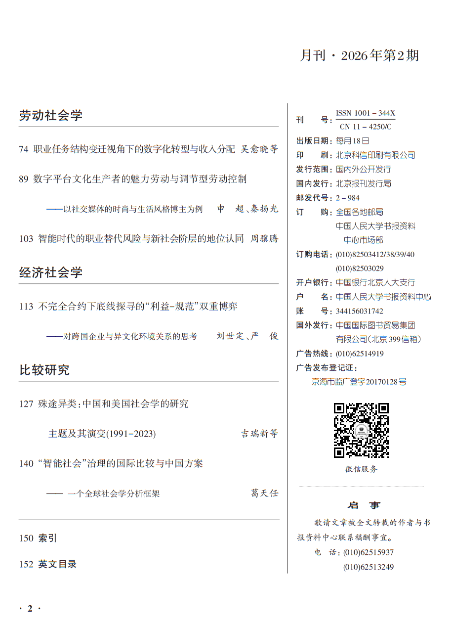 近日,人大复印报刊资料《社会学》2026年第2期全文转载了beat365体育官网平台助理研究员申超与本科生秦扬光共同撰写的题为《数字平台文化生产者的魅力劳动与调节型劳动控制——以社交媒体的时尚与生活风格博主为例》的高质量论文。该文原载于《社会学研究》2025年第4期。
