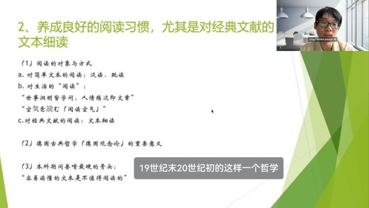 哲学强基班班主任李世杰率先为新生开启哲学之门,围绕文本阅读训练、哲学能力素养等核心要点展阐释,结合德国古典哲学实例,生动解析哲学学习的关键方法,并针对新生提出的学科疑问进行深入浅出的解答。他强调,本科阶段是哲学学习的基础期,鼓励同学们扎实开展思想训练和文本训练,为后续深入研究筑牢根基。