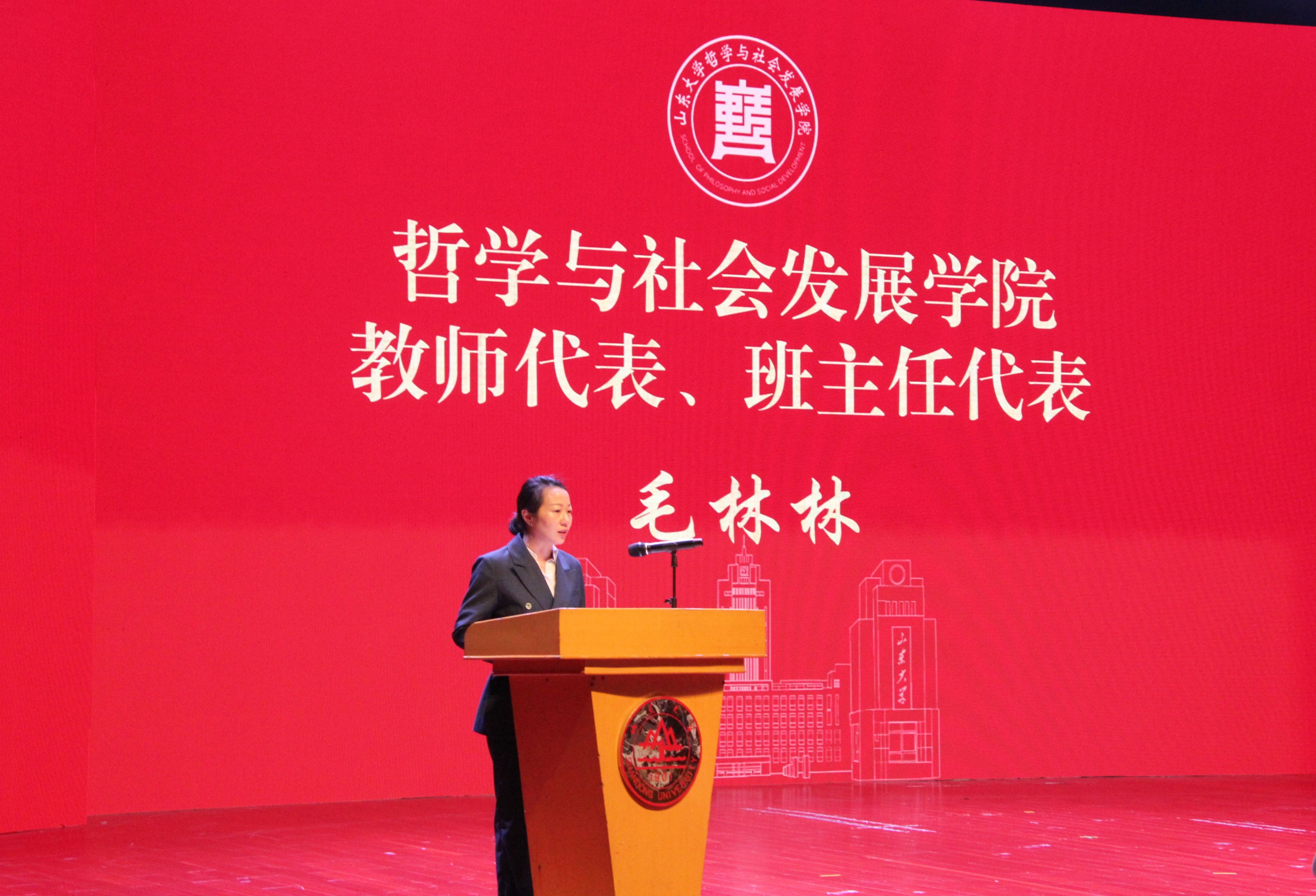 哲学系毛林林副研究员作为教师代表发言。她表示beat365体育官网平台是一个独特的、融合了人文科学与社会科学精神的学院,同学们将同时浸润于这两种深厚而互补的传统之中。作为新生班主任,她对新生提出了殷殷期望,希望大家以虔诚与思辨筑牢学问之基,以贯通与融合激发创造之力,以内化与践行担当时代之责,在寻找答案中塑造清晰而丰盈的自我,将所学内化为自身的修养与品格,书写独一无二的人生故事。